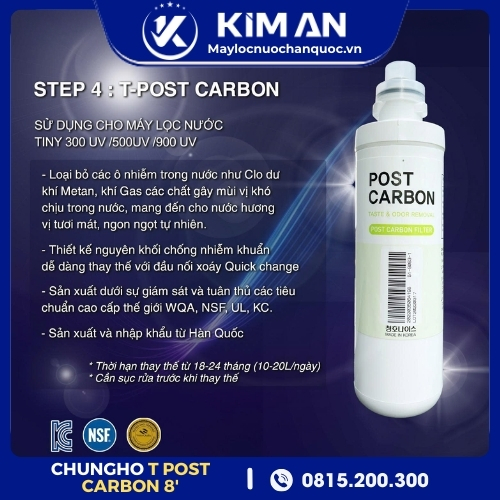 Lõi lọc T Post Carbon 8” được thiết kế chuyên biệt cho máy lọc nước đặt bàn ChungHo Tiny 300 UV – model CHP-2321D.