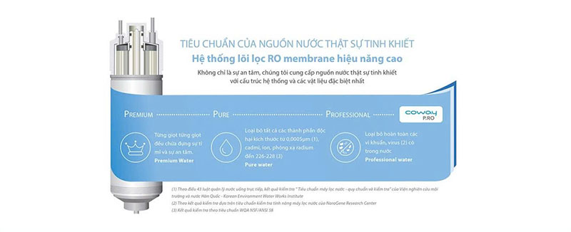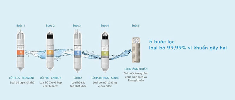 - Kim loại nặng, chất hòa tan gây hại, vi khuẩn, vi sinh vật nhờ màng RO và lõi kháng khuẩn.