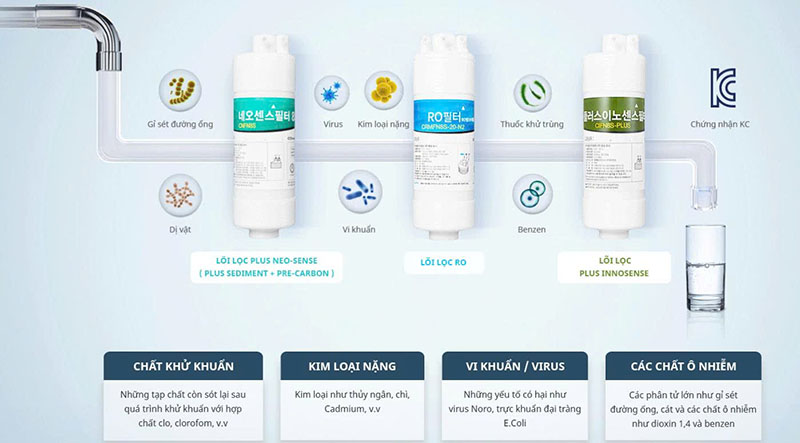 - Thay lõi lọc đúng chu kỳ: lõi Sediment/Pre-Carbon (Neo-Sense) ~ 6 tháng, màng RO ~ 20–24 tháng, lõi Post-Carbon / Kháng khuẩn theo hướng dẫn.