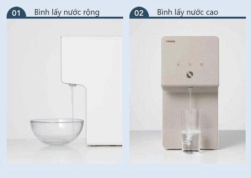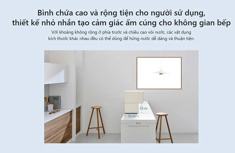- Vòi lấy nước đặt ở vị trí cao dễ dùng với nhiều loại cốc, bình chứa khác nhau, không sợ vướng víu.