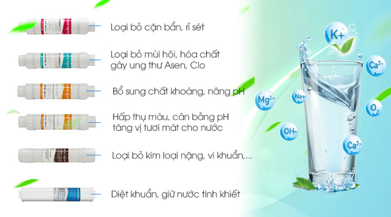 Bộ 9 lõi lọc nhập khẩu từ APS – Hàn Quốc, đúc nguyên khối, vô trùng, giúp ngăn ngừa rò rỉ và ô nhiễm chéo. Thiết kế này đảm bảo nước sau lọc luôn đạt độ tinh khiết cao và an toàn để uống trực tiếp.