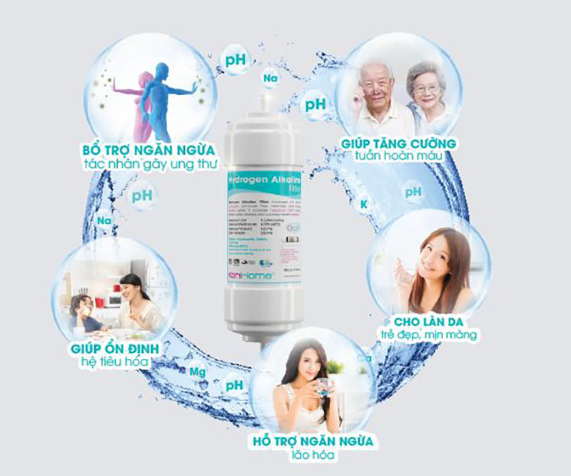 Lõi Hydrogen Alkaline tạo ra nước giàu hydrogen – một chất có khả năng chống oxy hóa mạnh, hỗ trợ làm chậm quá trình lão hóa tế bào, cải thiện tuần hoàn máu và tăng cường sức đề kháng.