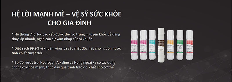 Máy được trang bị hệ thống 7 lõi lọc đúc nguyên khối, chống tái nhiễm khuẩn, dễ dàng thay thế và đảm bảo chất lượng nước đầu ra luôn tinh khiết.