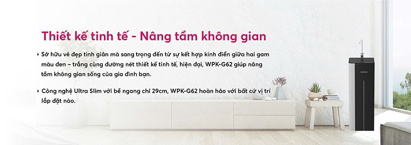 Với chiều ngang chỉ 29cm, máy lọc nước Korihome WPK-G62 mang đến kiểu dáng cực kỳ gọn gàng, dễ dàng đặt tại bếp, phòng khách hay các khu vực nhỏ mà vẫn toát lên vẻ sang trọng, hiện đại.