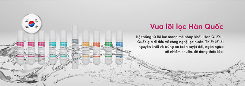 Korihome WPK-G62 sở hữu 10 lõi lọc nguyên khối nhập khẩu từ Hàn Quốc – quốc gia hàng đầu về công nghệ lọc nước. Lõi nguyên khối đảm bảo an toàn, ngăn tái nhiễm khuẩn và dễ tháo lắp hơn lõi rời thông thường.