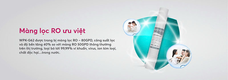 WPK-G62 được trang bị màng lọc RO 80GPD cao cấp, cho khả năng lọc vượt trội hơn 40% so với RO 50GPD thông thường, giúp loại bỏ tới 99,99% vi khuẩn, virus, kim loại nặng và các chất độc hại.