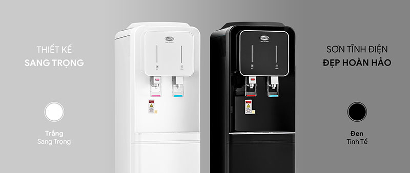 ♦ Thiết kế tủ đứng sang trọng, bình chứa inox 304 bền bỉ, khay hứng nước tháo rời tiện vệ sinh.