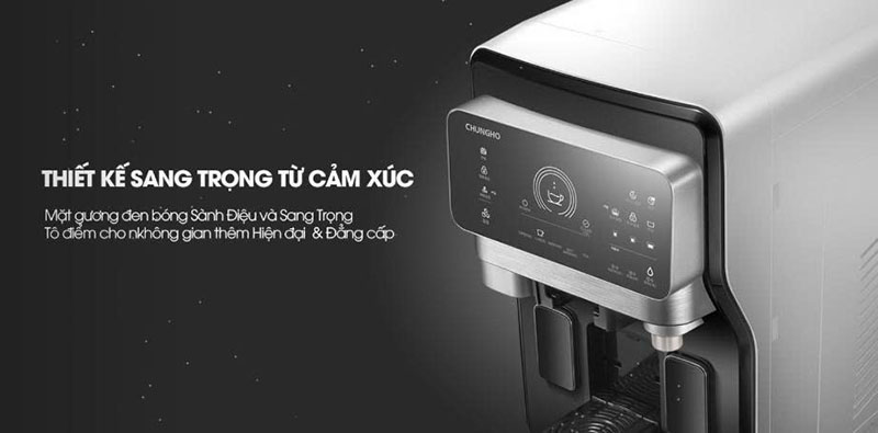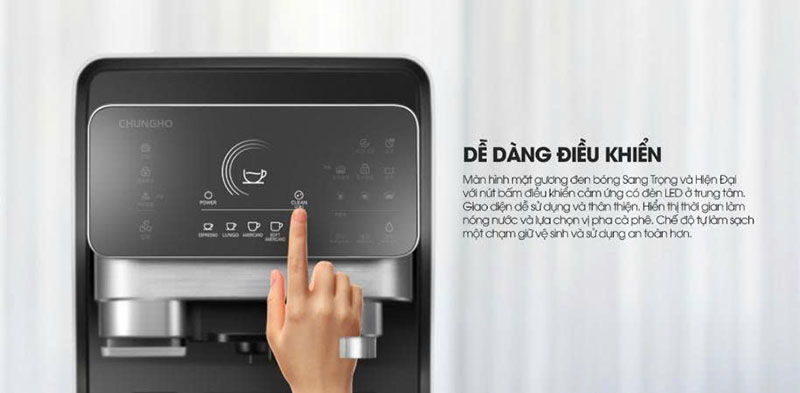 Màn hình gương đen cảm ứng với đèn LED sáng rõ và nút bấm thông minh, dễ thao tác, giúp người dùng điều chỉnh nước nóng – lạnh – nguội hoặc pha cà phê, làm đá một cách trực quan.