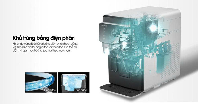 Hệ thống tự động làm sạch ACS giữ cho đường nước luôn sạch sẽ, kết hợp với công nghệ khử trùng điện phân, giúp vệ sinh bình chứa, đường ống và vòi nước hiệu quả. Người dùng có thể cài đặt thời gian khử trùng tùy ý.