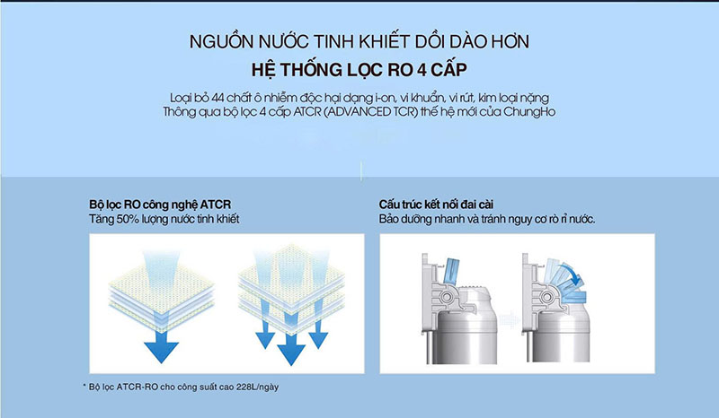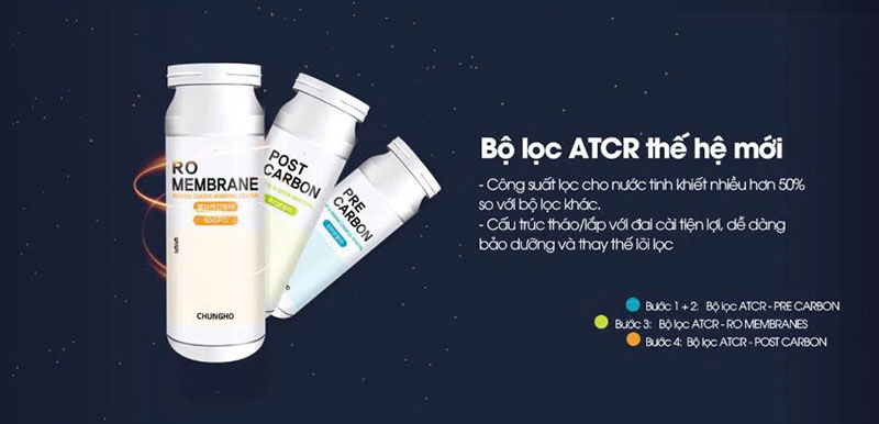 Hệ thống lọc RO 4 cấp sử dụng bộ lọc thế hệ mới ATCR cho hiệu quả lọc vượt trội: