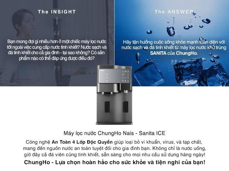 Máy lọc nước ChungHo Sanita ICE không chỉ là một thiết bị lọc nước mà là biểu tượng của phong cách sống hiện đại: sạch sẽ – an toàn – thông minh – tiện nghi.