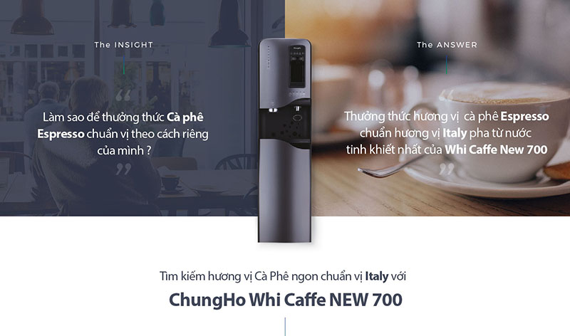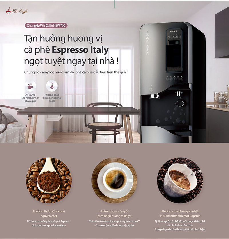 Tận hưởng trọn vẹn hương vị cà phê Espresso chuẩn Ý chỉ bằng một chạm ngay tại nhà hoặc văn phòng với ChungHo WHI Caffe – thiết bị đầu tiên trên thế giới tích hợp cả hệ lọc nước RO, làm đá, 4 chế độ nước và pha cà phê viên nén trong một máy duy nhất. Thiết kế hiện đại, chức năng thông minh, đây là giải pháp hoàn hảo cho nhu cầu nước và cà phê chuẩn sạch mỗi ngày.
