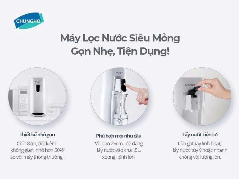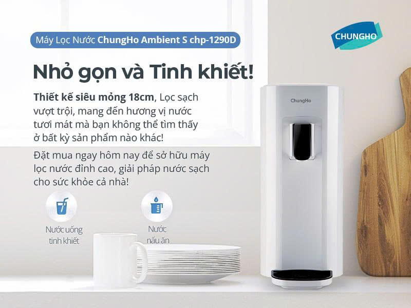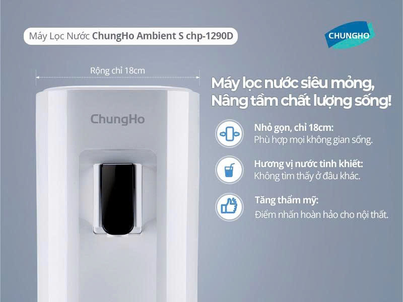 Với bề rộng chỉ 18cm, ChungHo CHP-1290D chiếm chưa đến 50% không gian so với các máy lọc nước để bàn thông thường, giúp tối ưu hóa diện tích bếp, phù hợp với gia đình có không gian nhỏ.
