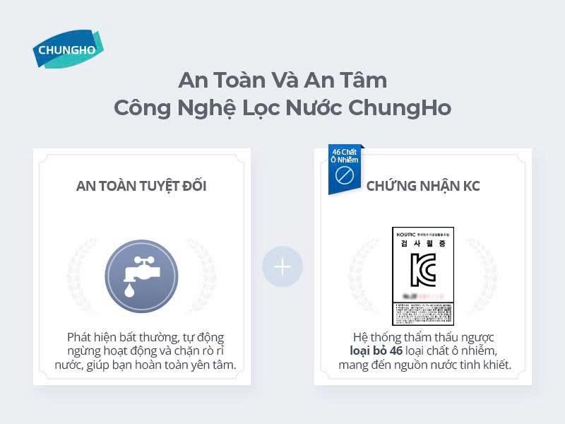 Máy lọc nước ChungHo CHP-1290D đạt chứng nhận KC Hàn Quốc – chứng nhận loại bỏ 46 chất độc hại trong nước theo tiêu chuẩn RO. Đây là minh chứng rõ ràng cho độ an toàn và hiệu quả xử lý nước của sản phẩm.