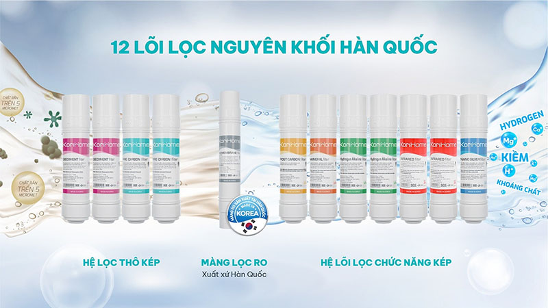 | Các lõi chức năng | Hệ lõi chức năng kép nguyên khối hiệu suất cao: 1 lõi Post Carbon; 2 lõi Hydrogen Alkaline; 1 lõi Mineral; 1 lõi Nano Silver; 2 lõi Far Infrared |